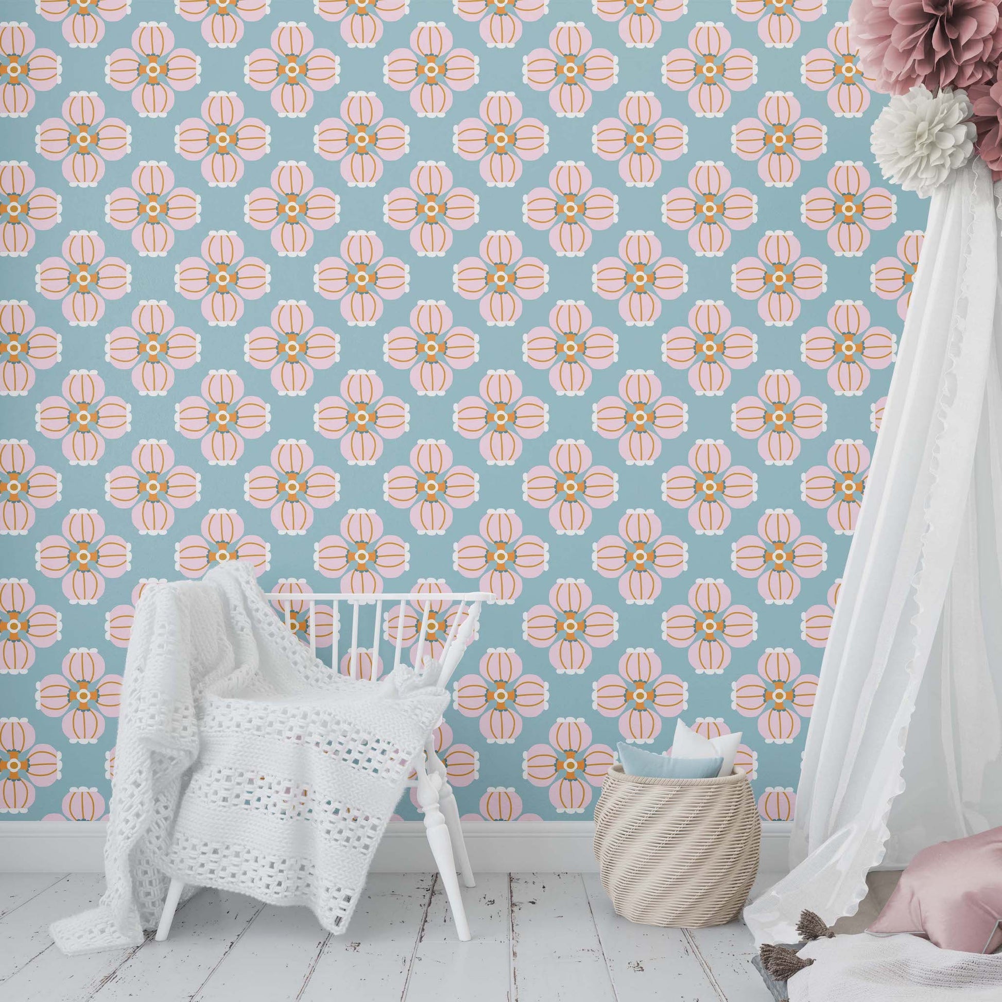 Pattern Description: This is a sweet wallpaper with pink puffy flowers including a small white ruffle detail throughout. The design features a subtle turquoise background. Wallpaper is one of the most popular ways to transform a space without a major commitment. Our wallpapers are crafted to enhance the texture and style of your space.