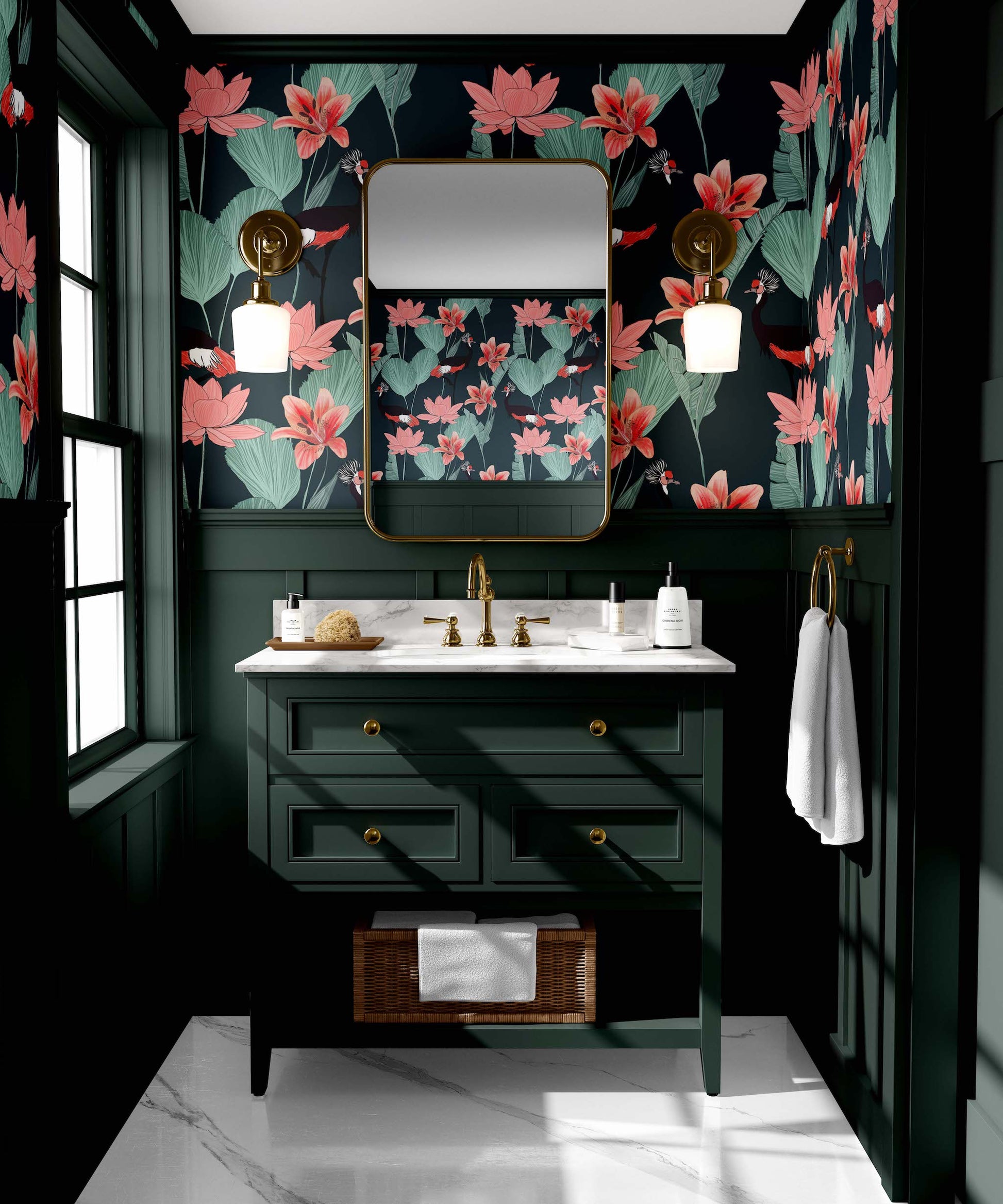Pattern Description: This is a subtle coastal wallpaper featuring exotic crowned cranes walking through a lily flower garden. There are two color options: deep, moody green or white.