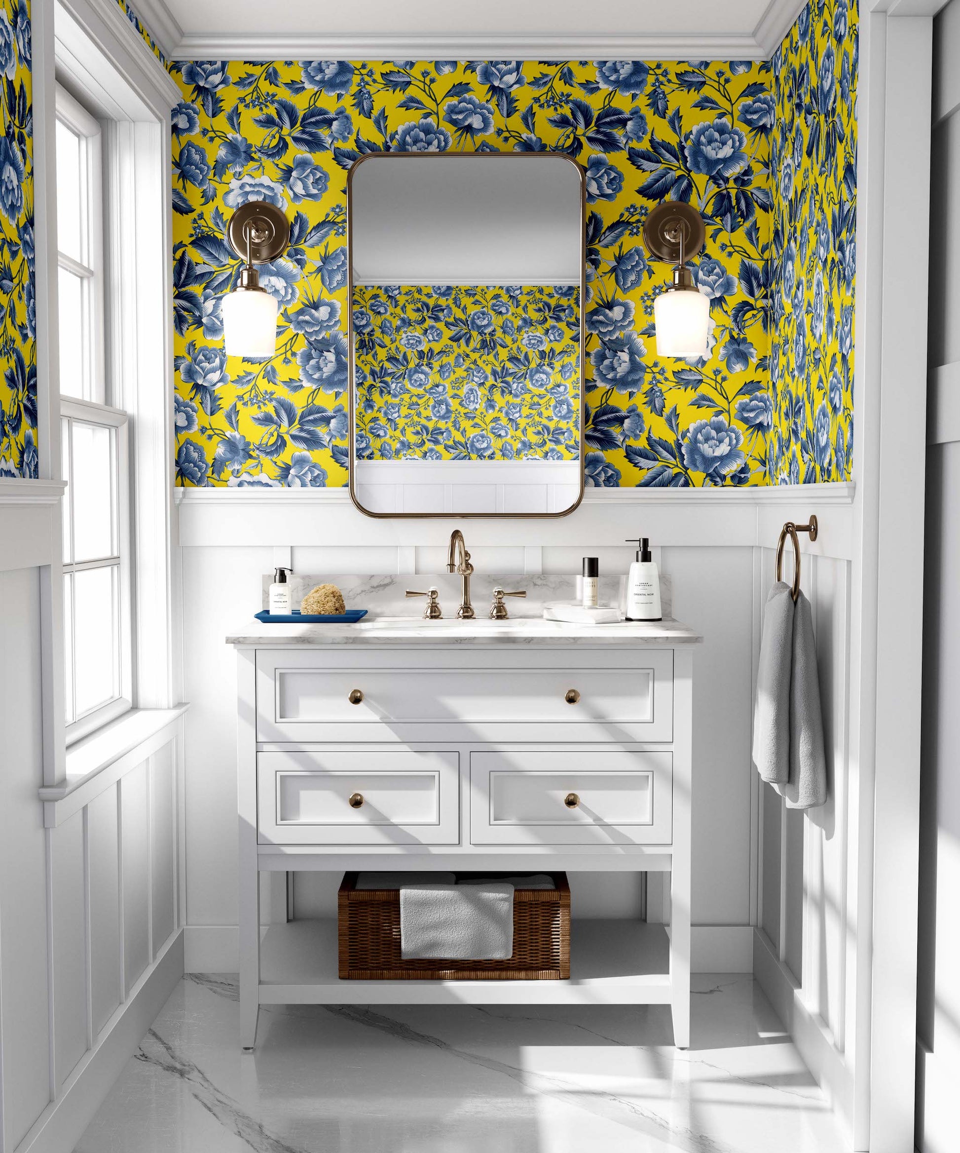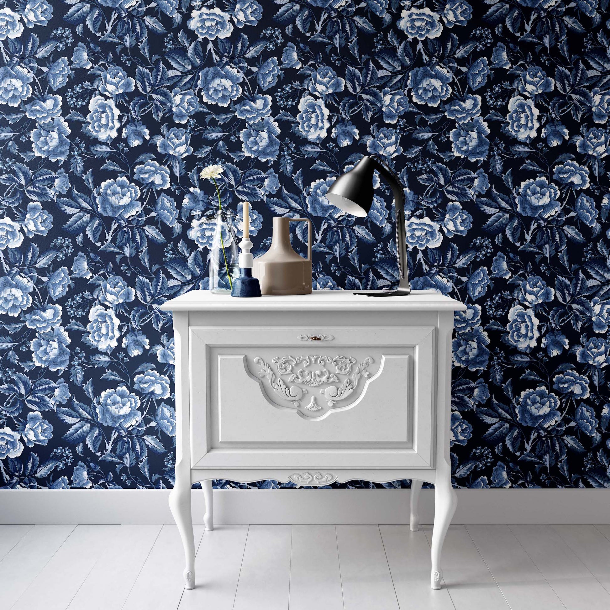 Pattern Description: This wallpaper features shades of navy denim roses on a deep yellow, navy blue, or white background. Wallpaper is one of the most popular ways to transform a space without a major commitment. Our wallpapers are crafted to enhance the texture and style of your space.