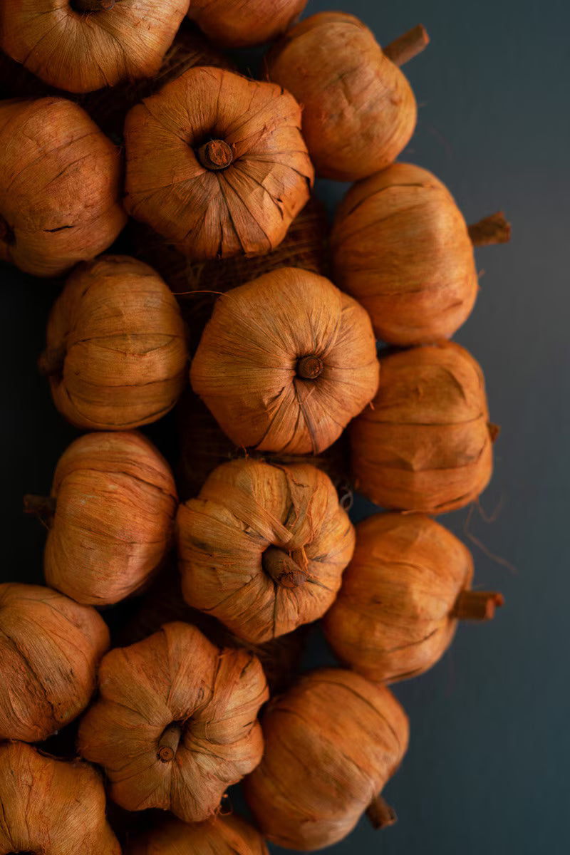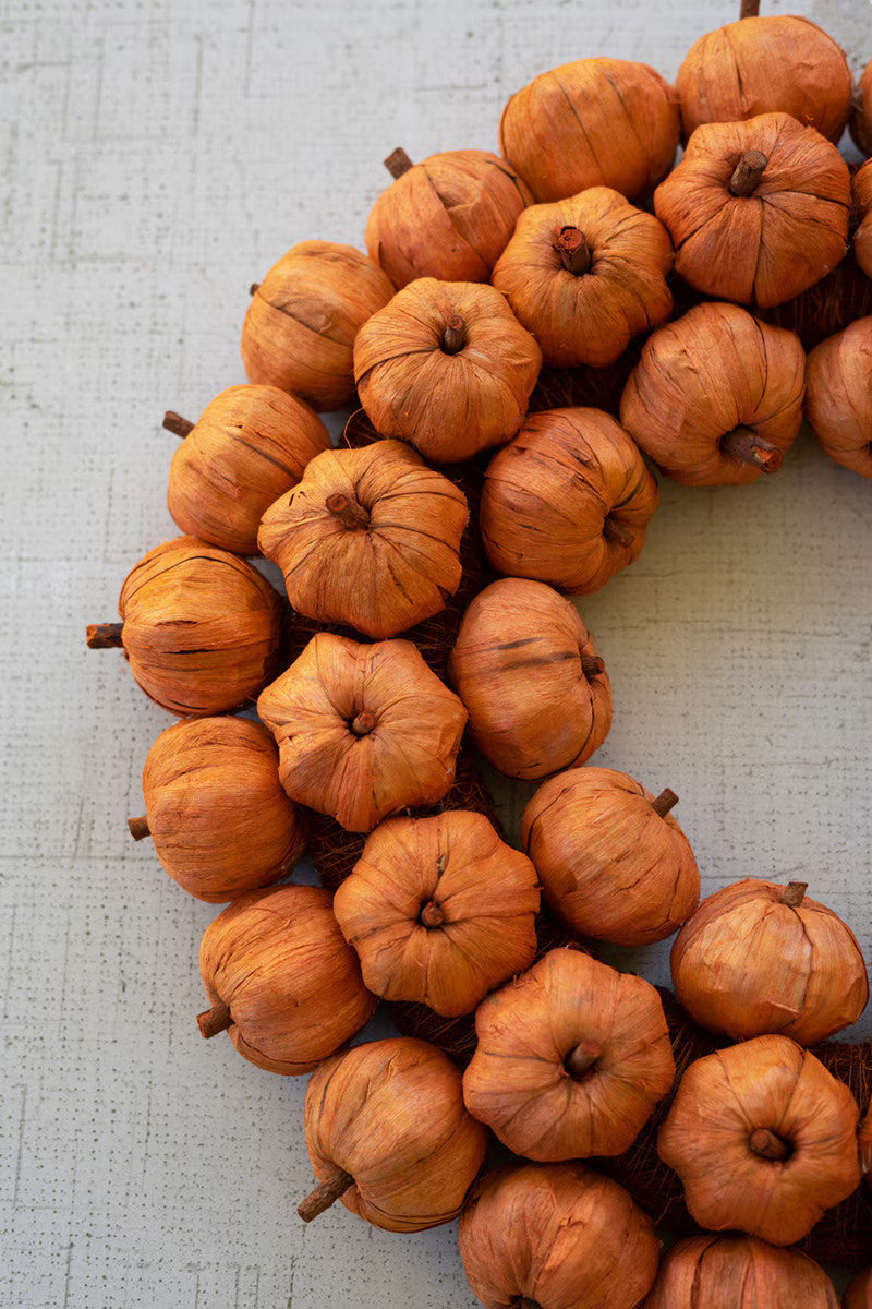 Here's a pumpkin wreath for your decorating needs this fall-iday season. Orange you glad you found this pretty pumpkin decor? Natural material, so size and shape will vary.