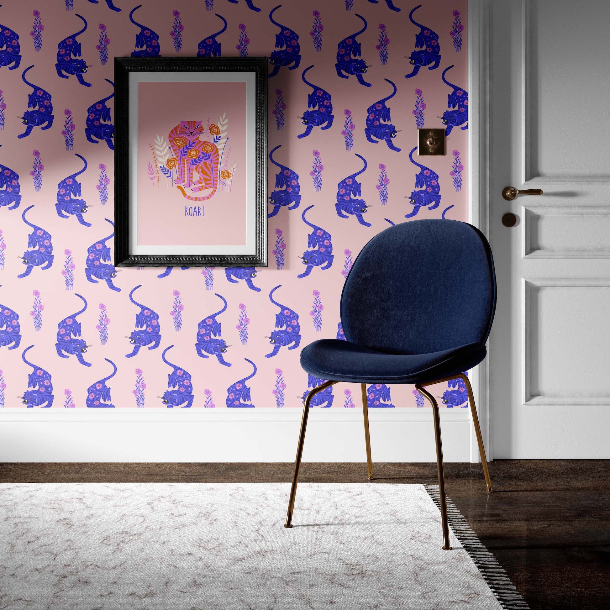 Pattern Description: This is a modern folk art tiger pattern that features purple tigers with pink flower spots on a subtle rose-pink background. Wallpaper is one of the most popular ways to transform a space without a major commitment. Our wallpapers are crafted to enhance the texture and style of your space.