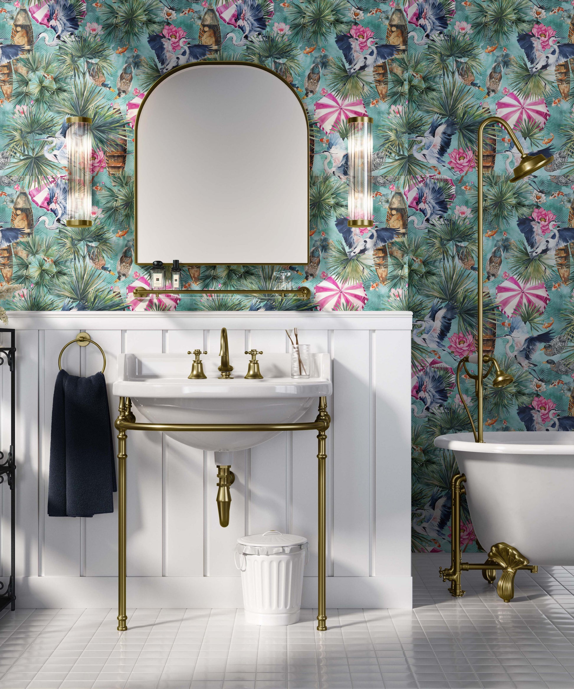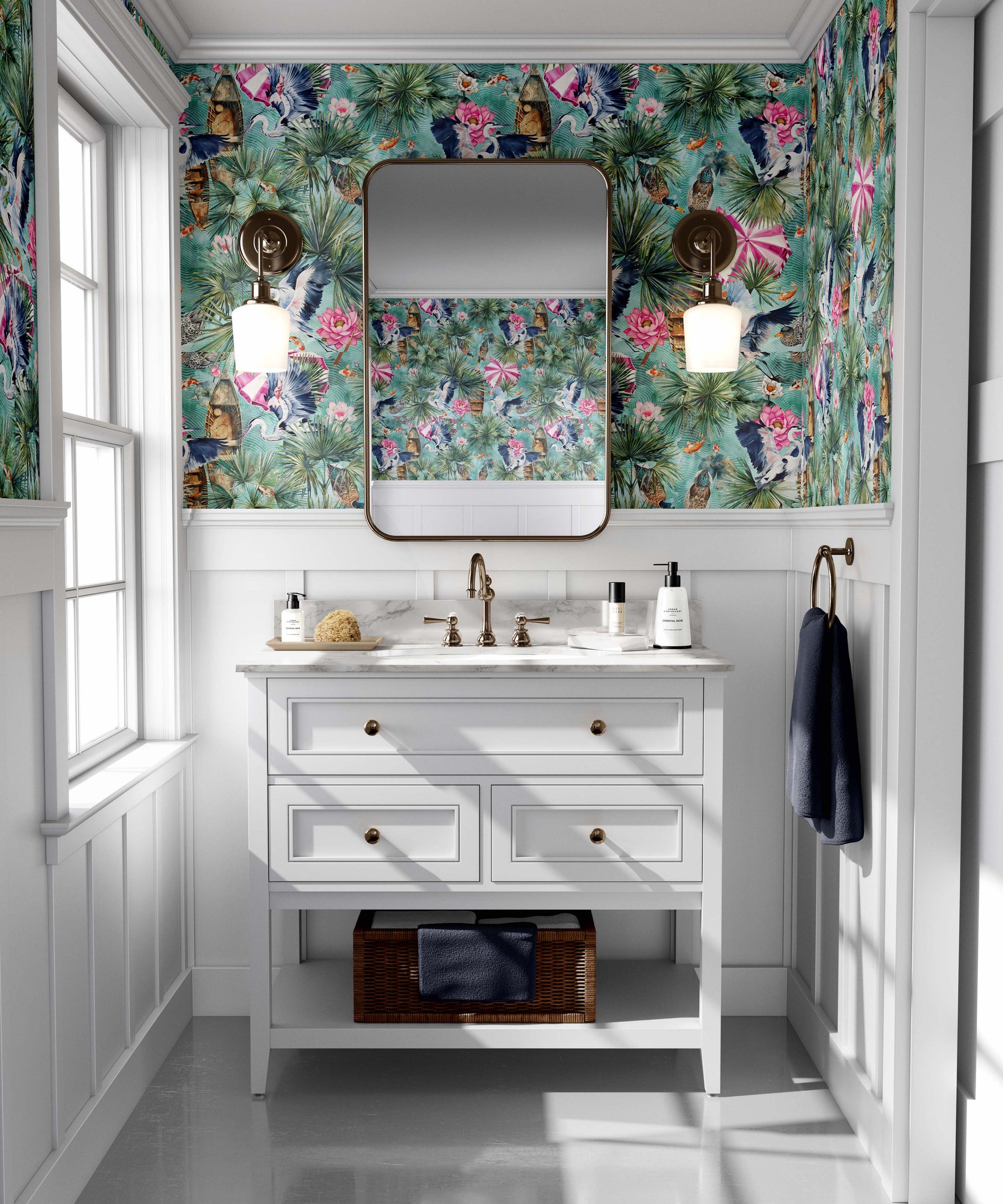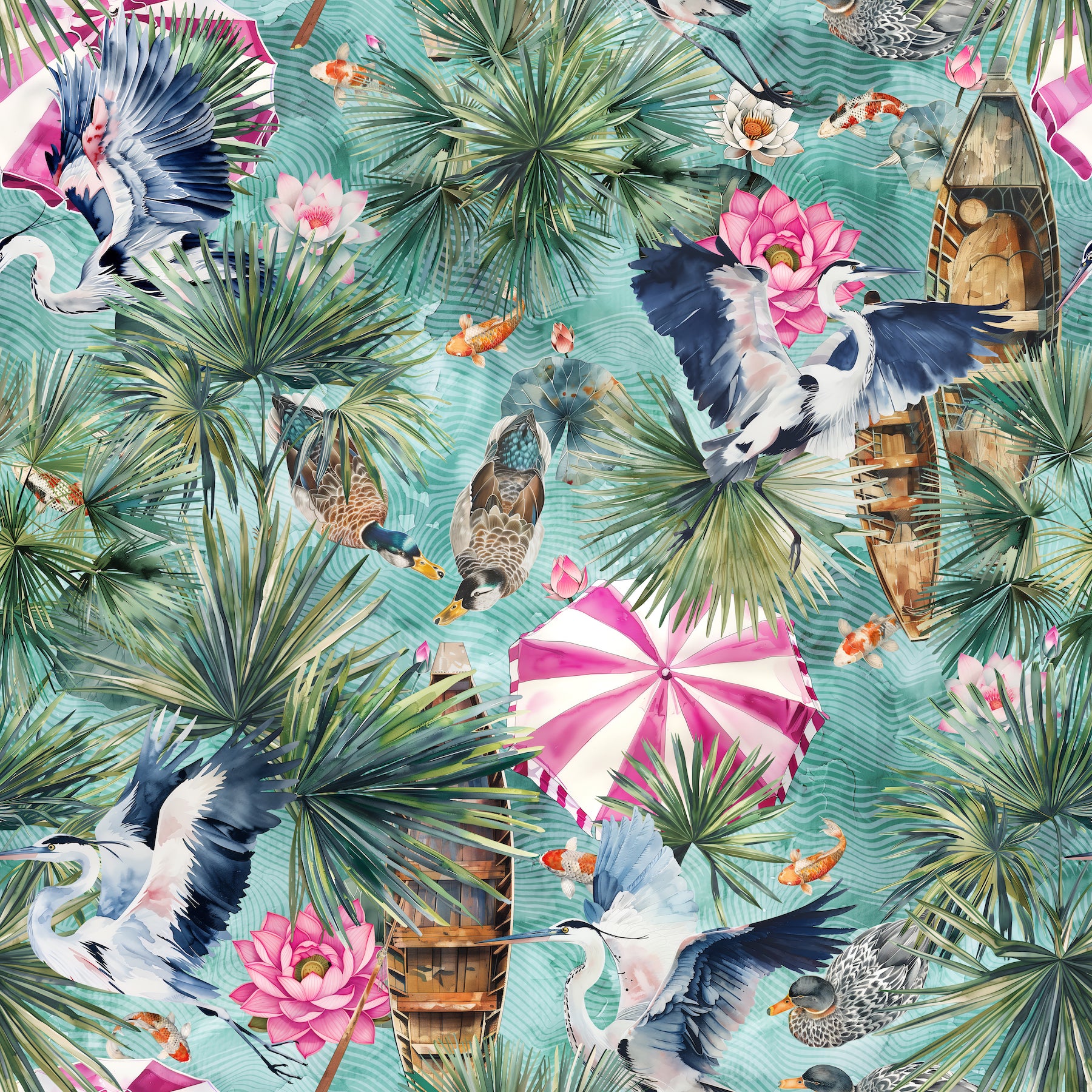 Pattern Description: Wrap your walls in this luxurious beach house wallpaper on a wavy marine green background. This wallpaper features wooden gondolas, palm trees, tropical birds, and classic pink-striped cabana umbrellas. Wallpaper is one of the most effective ways to revitalize a room without a major commitment. Elevate your interior with our wallpaper collection, crafted to add texture and style that will leave a lasting impression.