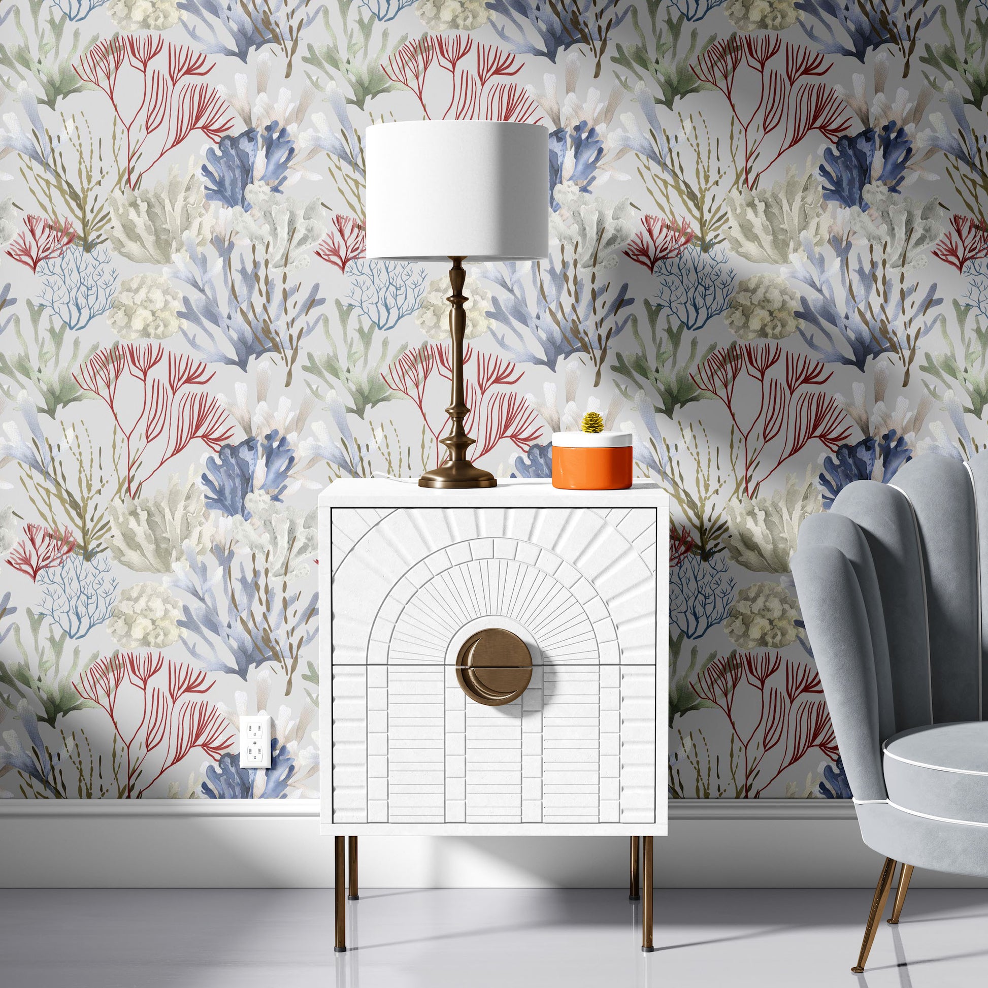 This soft-colored ocean coral wallpaper features a gray background with sea corals in neutral grays, blues, and deep reds. Perfect for your beach-styled home this coastal wallpaper is tasteful and we love it. Wallpaper is one of the most popular ways to transform your room without a huge commitment. Our wallpapers are made to add texture and style to your space.