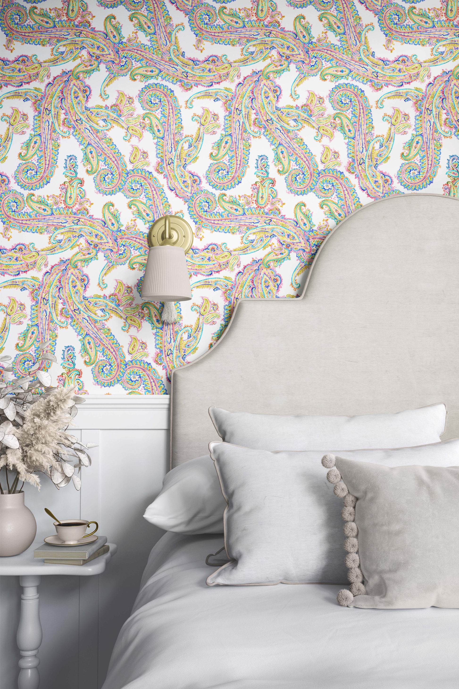 Pattern Description: Brighten up your space with this vibrant-colored, modern paisley wallpaper. Featuring a white background with beautiful paisley in turquoise, hot pink, and yellow, this decor is sure to leave a lasting impression. Wallpaper is one of the most effective ways to revitalize a room without a major commitment. Elevate your interior with our wallpaper collection, crafted to add texture and style that will leave a lasting impression.