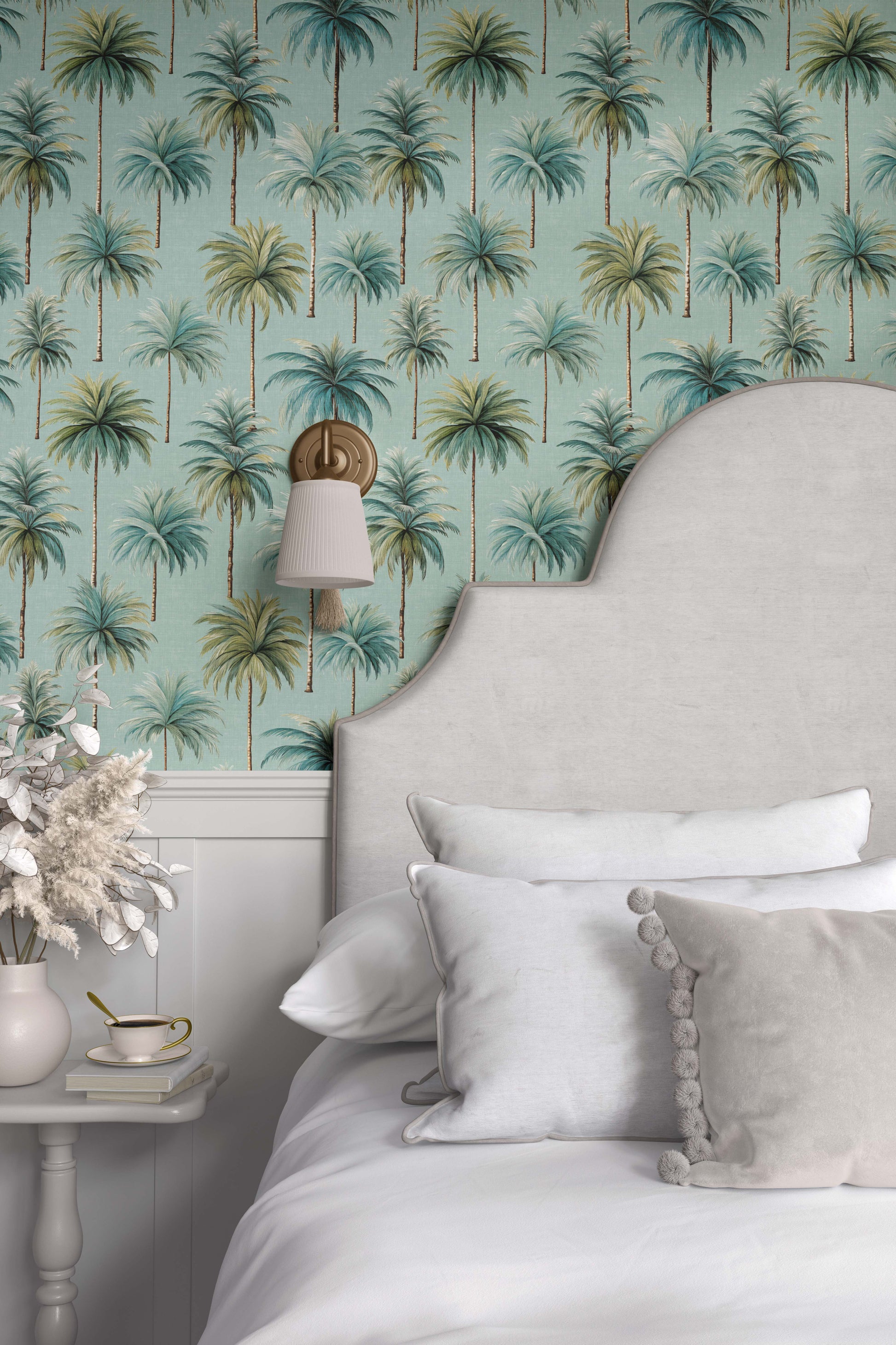 Pattern Description: A soft tropical palm wallpaper with lots of natural colors pairs nicely to elevate home decor. We love the gentle exotic feel this wallpaper gives. This wallpaper is featured in two color backgrounds: pink or blue. Zoom in to see the added texture in the design.