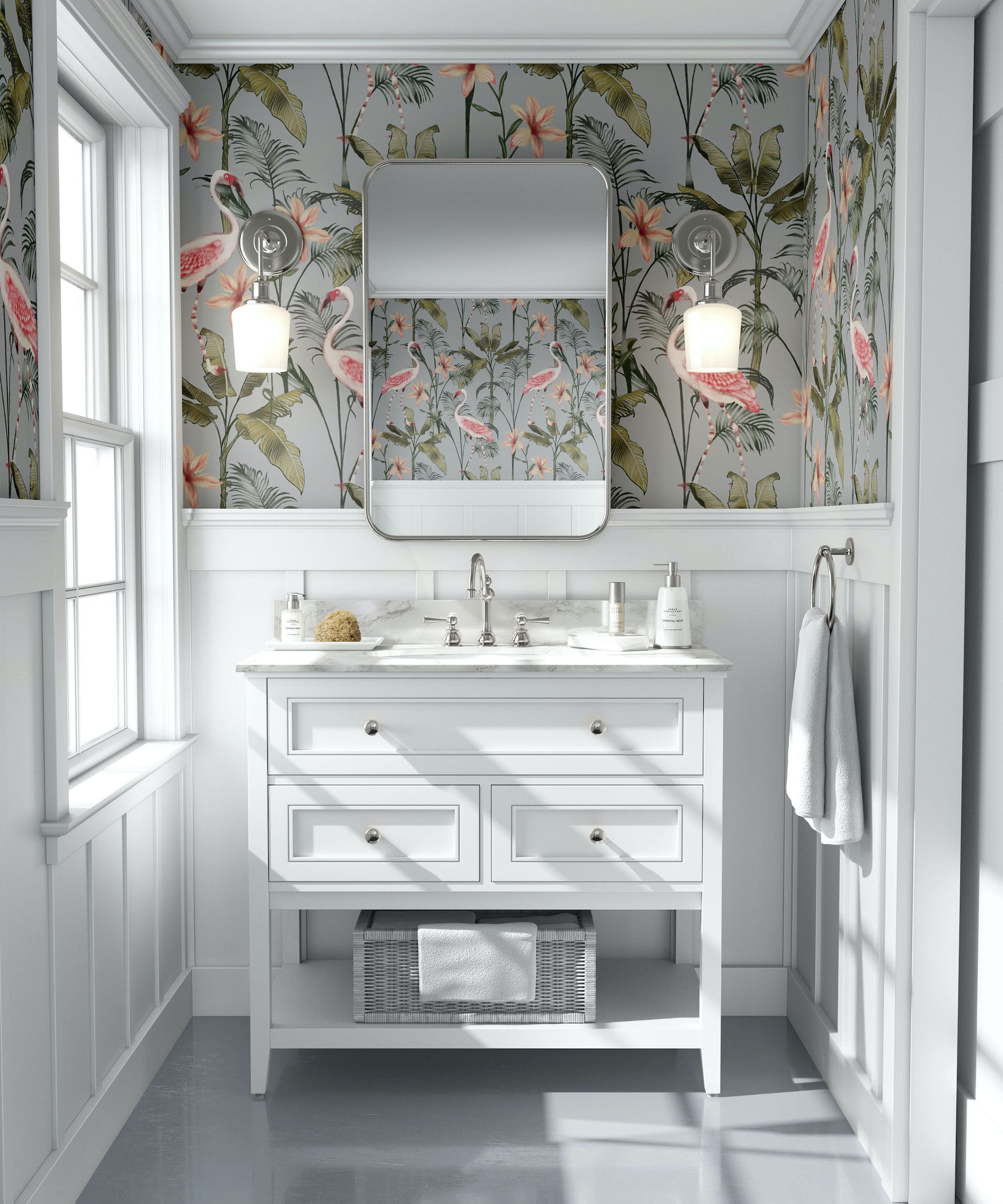 Pattern Description: This tropical summer wallpaper features detailed pink flamingos with fun striped legs walking through a lily flower garden and palm trees. Wrap any room with this wallpaper to add more to your coastal beach home decor. This wallpaper has two background color options: either pink or gray. Elevate any room with this beautiful wallpaper, making it a perfect choice for those who appreciate elegance and charm.