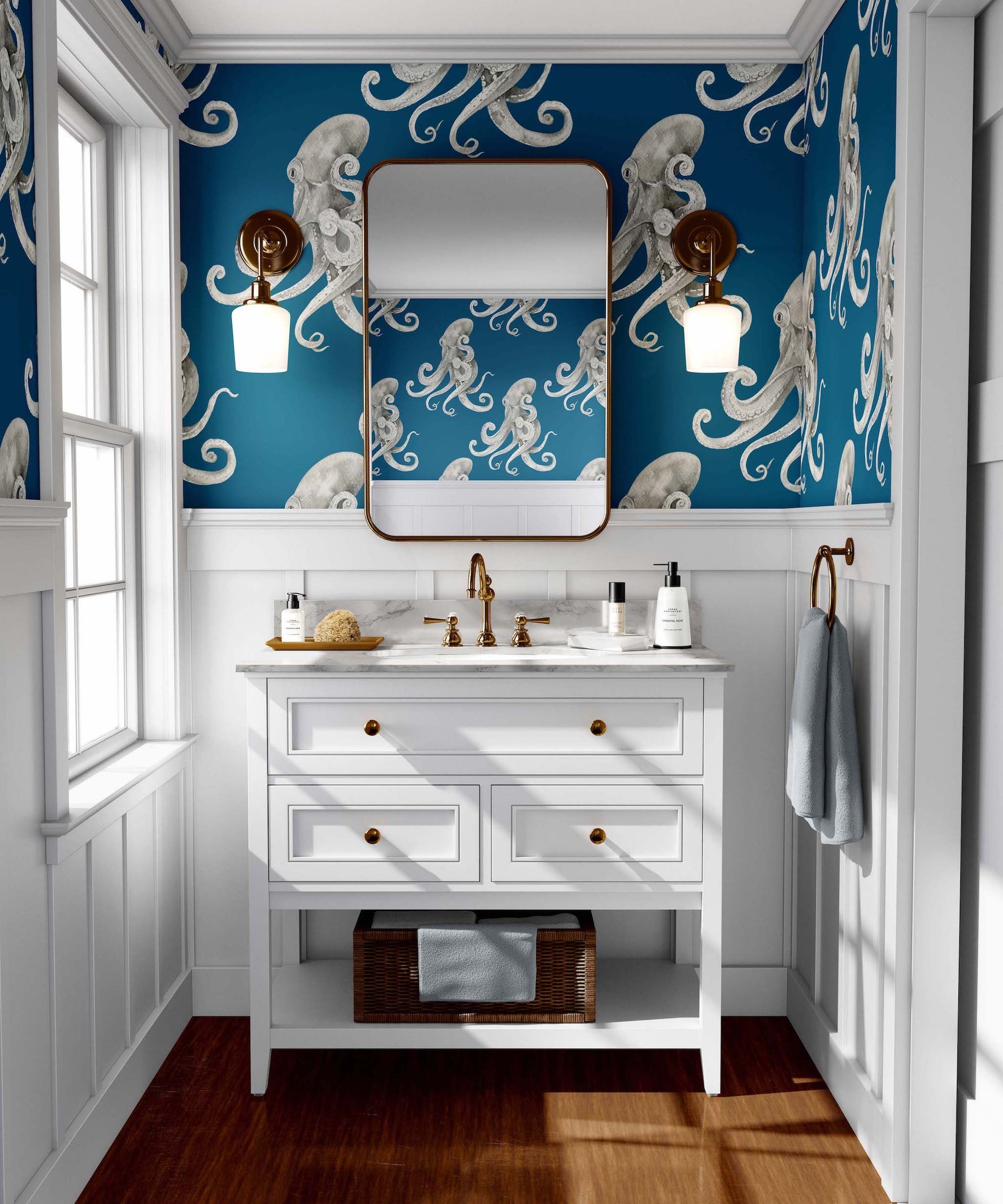 Pattern Description: Transform your space with our stunning wallpaper, featuring an enchanting watercolor gray octopus design. Choose between a vibrant mustard yellow or a soothing ocean blue background to perfectly complement your style. This captivating wallpaper is a must-have for beach houses and coastal-themed homes alike, effortlessly bringing a touch of the seaside into any room. Ideal for hallways or bathrooms, this design will elevate your decor and create an inviting atmosphere that you and your guests will adore. Don’t miss out on this beautiful addition to your home! Wallpaper is one of the most effective ways to revitalize a room without a major commitment. Elevate your interior with our wallpaper collection, crafted to add texture and style that will leave a lasting impression.